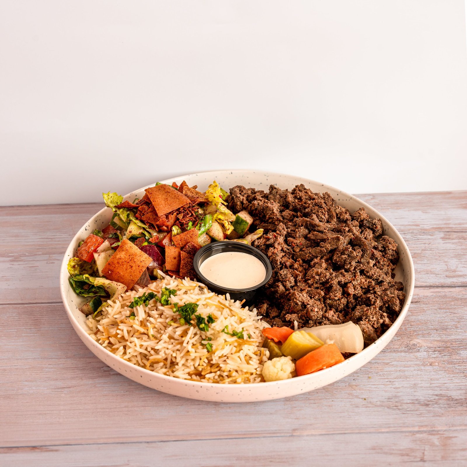Sliced Shawarma Beef, Tahini, Onion, Parsley, Tomato, Pickles