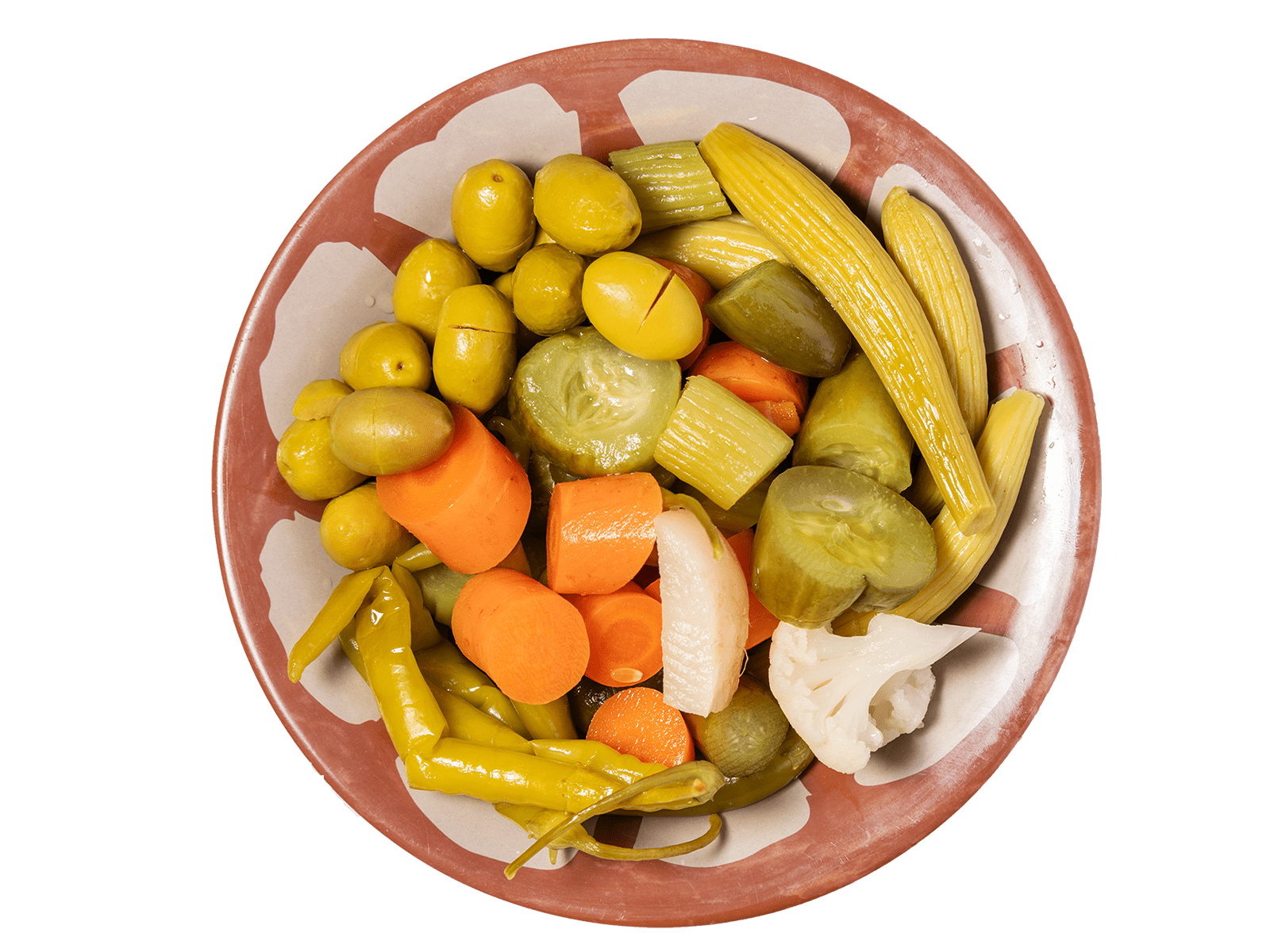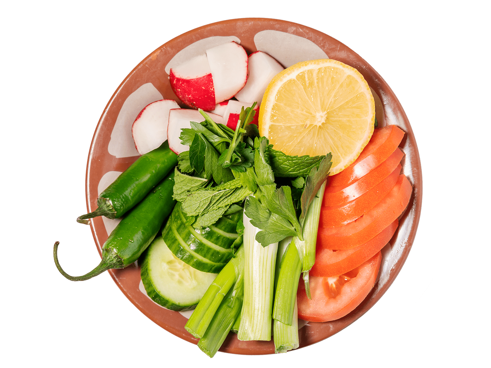 cucumber . Tomato . Radish . Green onion. Mint . Hot green pepper. Lemon