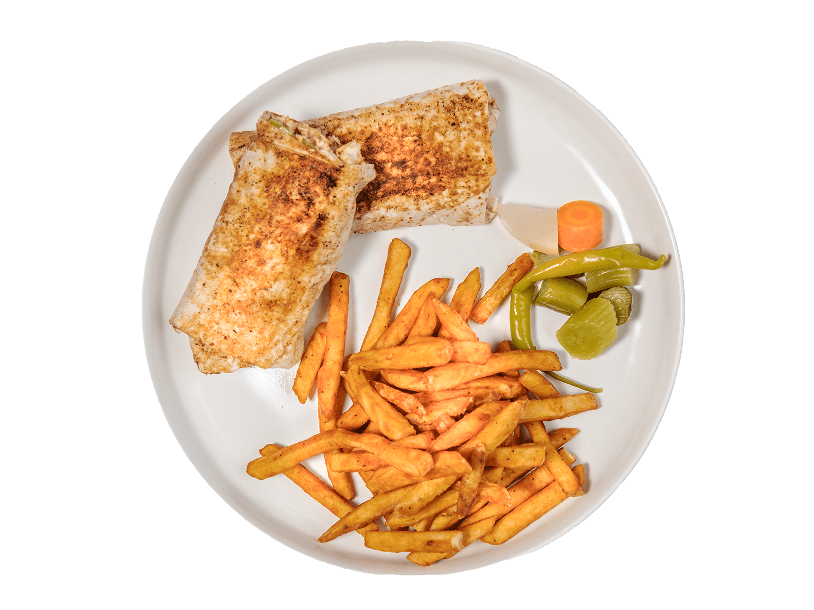 Sliced Shawarma Chicken, Garlic Spread, Garlic Sauce, Fried Potatoes, Pickles